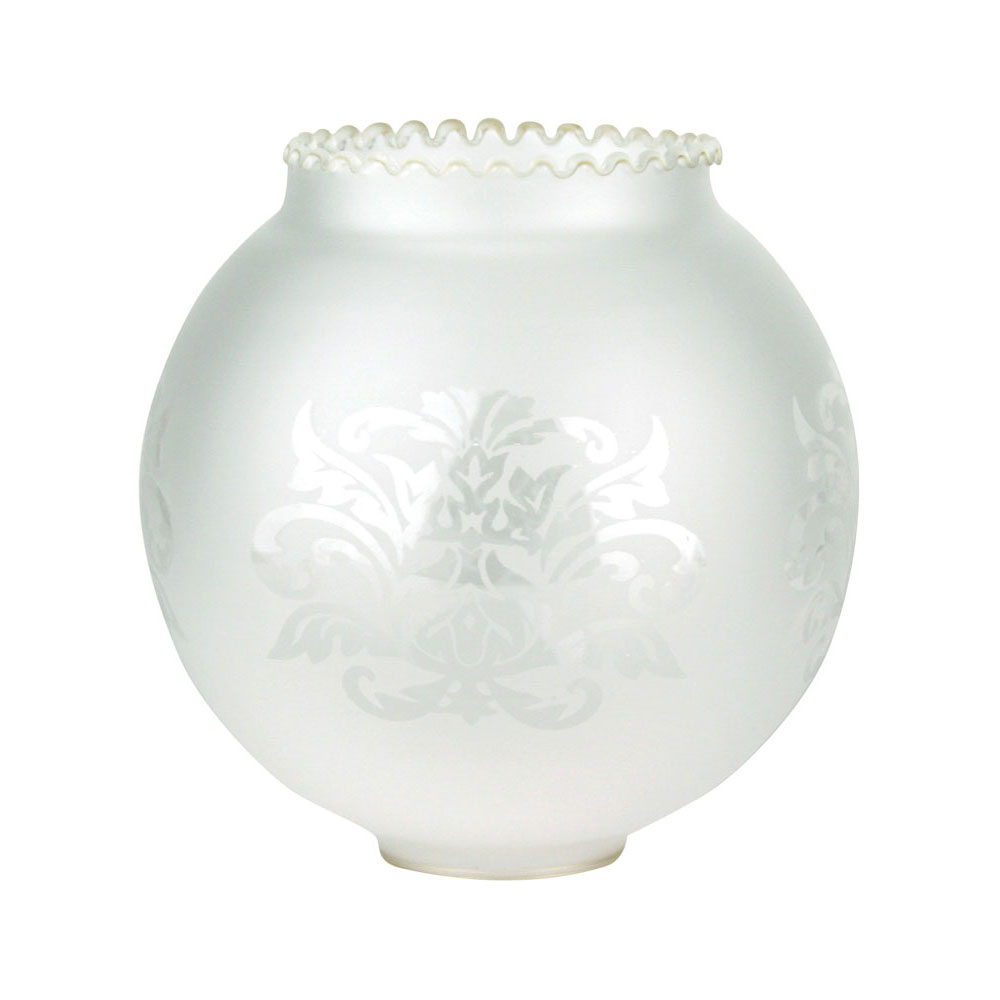 Spanish Replacement Glass. Model Q040- frosted white replacement glass. This spherical-shaped glass features a beautiful floral design etched into its side and a rippled lip. The opening of the glass is 50mm and is made for use with a spring clip.